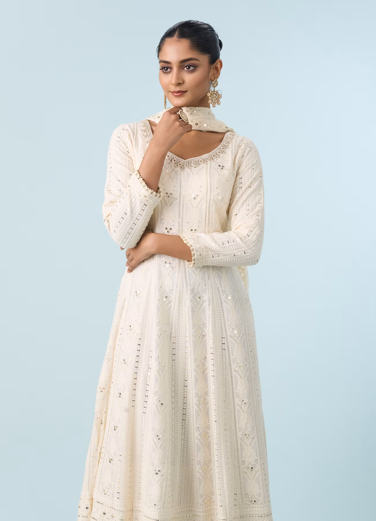 The Glittering Georgette Cream Anarkali Suit is a graceful blend of elegance and subtle glamour. Crafted from lightweight georgette fabric, it drapes beautifully and offers a flowy, flattering silhouette. The soft cream shade is enhanced with delicate glittering details, adding a touch of sparkle without overpowering the look. Perfect for weddings, festive occasions, and evening celebrations, this Anarkali suit delivers timeless charm with a refined, luxurious feel.