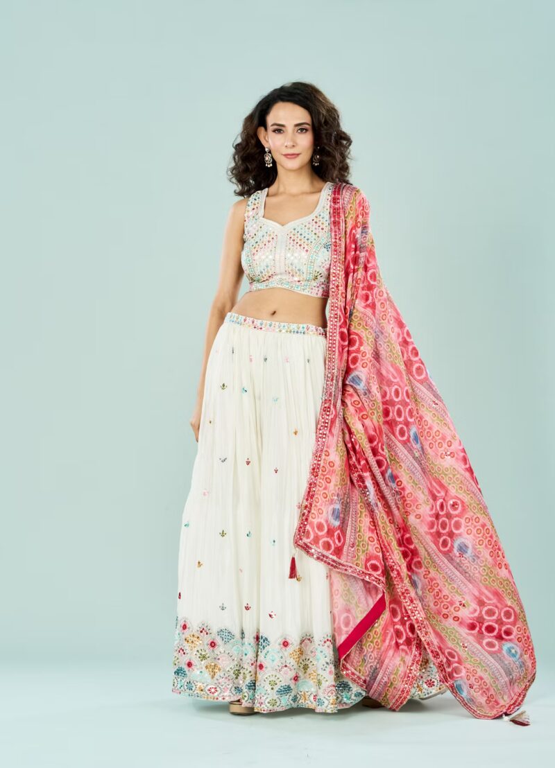 The Cream Divine Crepe Lehenga is a perfect expression of subtle elegance and contemporary style. Made from premium crepe fabric, it drapes beautifully and offers a smooth, lightweight feel for all-day comfort. The soft cream hue adds a refined, graceful charm, while delicate detailing enhances its sophisticated appeal. Ideal for weddings, festive occasions, and formal celebrations, this lehenga creates a polished and timeless look that effortlessly balances simplicity with luxury.