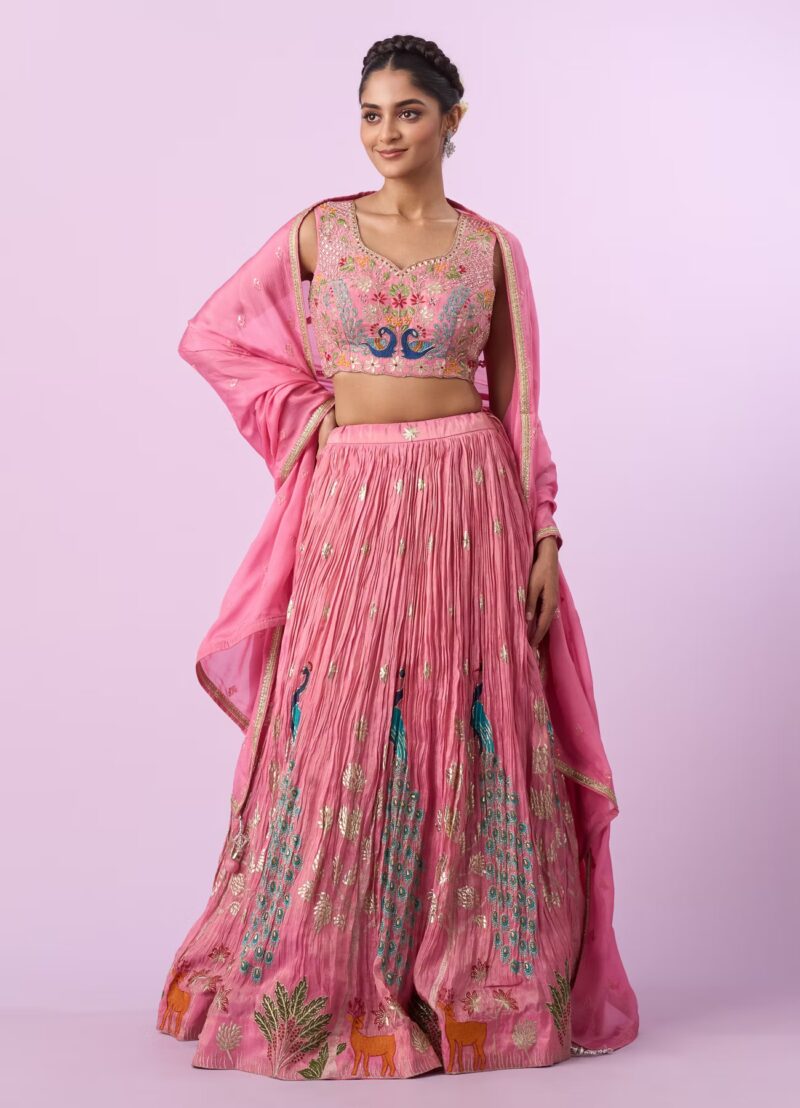 The ensemble comes together beautifully with a meticulously detailed blouse, a gracefully flowing skirt, and a refined dupatta that completes the look with effortless poise. The soft pink hue adds a romantic warmth, making the lehenga versatile yet unforgettable—perfect for receptions, engagements, festive gatherings, or intimate celebrations.