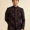 The rich brocade fabric forms a textured canvas, enhanced by jacquard artistry and subtle self-designs that create depth without overpowering the silhouette. Diamond motifs unfold across the ensemble with effortless elegance, while embellished buttons and an embroidered bandhgala collar—highlighted with fine rhinestone accents—add a gentle shimmer that elevates the look.