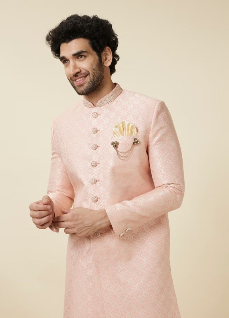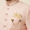 Paired with a contrasting off-white pant, the ensemble achieves a refined harmony that feels both contemporary and ceremonial. The thoughtfully included pocket square and brooch complete the outfit, ensuring a polished presence ideal for weddings, receptions, and formal celebrations.