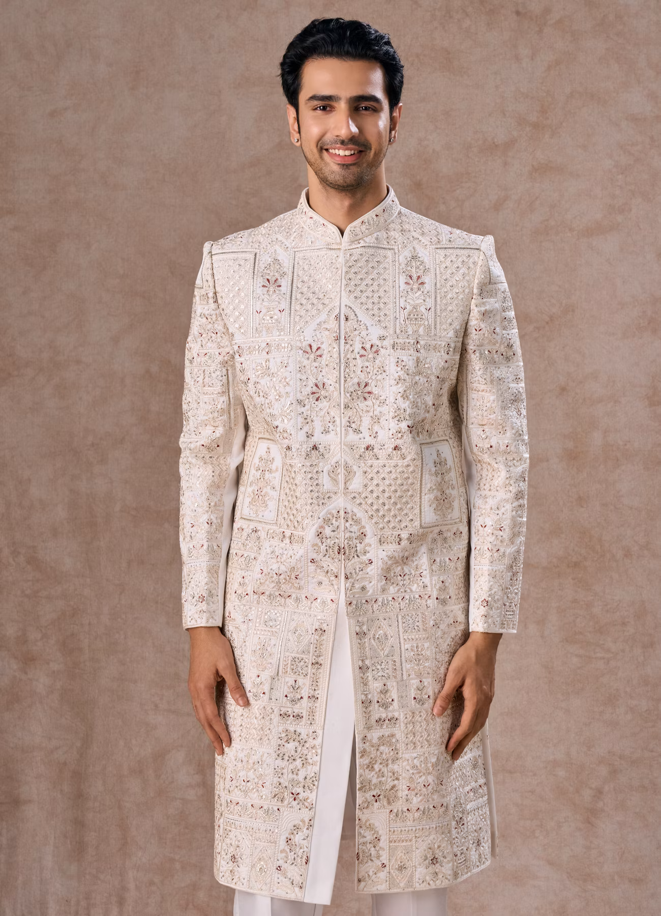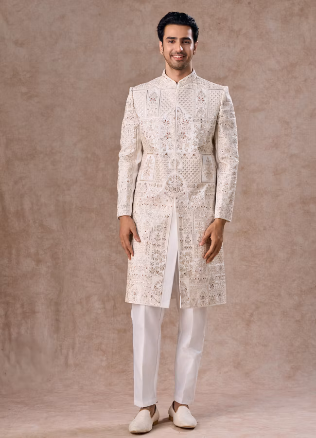 Timeless, regal, and effortlessly sophisticated, the Exquisite White Sherwani is crafted for those who value classic elegance with a refined modern appeal. The pristine white hue symbolizes grace and tradition, making this sherwani an ideal choice for weddings, receptions, and grand ceremonial occasions.